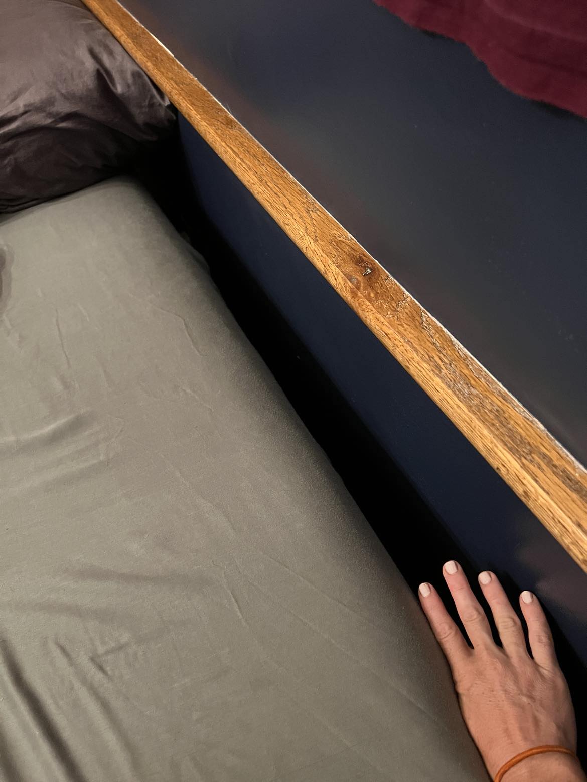 This is the distance the bed slides after one night of use. If we do not push the bed back up against the wall the gap widens, and pillows fall behind the bed.
